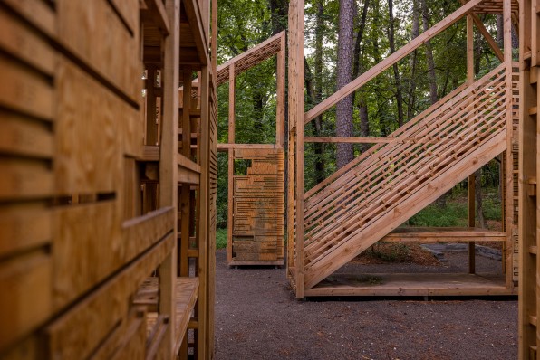 One of the prototypes, by Levenbetts, is a timber house built around a giant pine tree. Mass timber rafters form the cascading pitch of the home’s unfinished roof and blend seamlessly into the wooden walls and floors.Exploring the process and barriers to timber construction even in a timber-rich state like Arkansas, the prototype is embedded with details about the sourcing of the trees used to make the lumber, the facilities where it was processed, and the rules regulating timber construction.