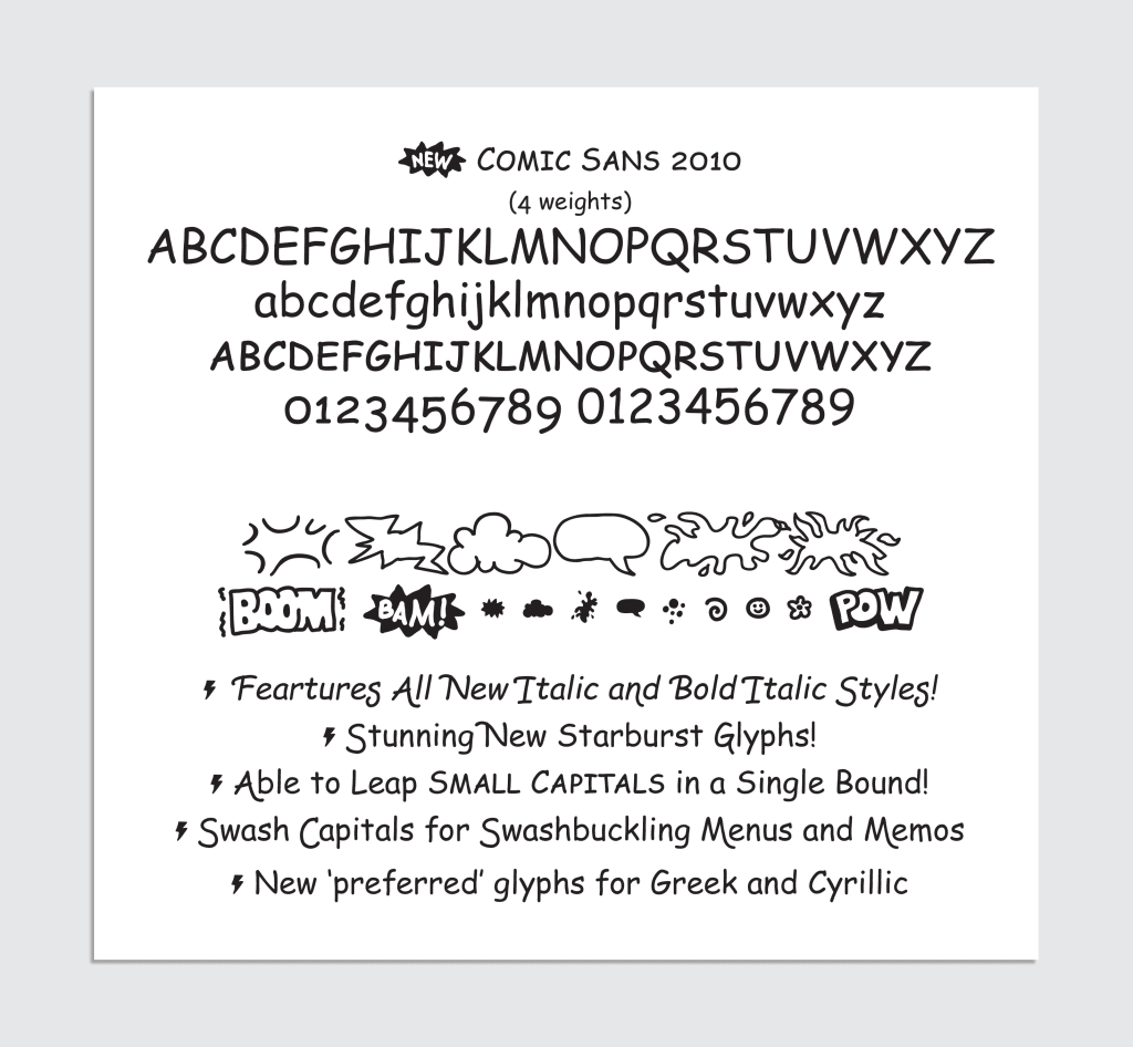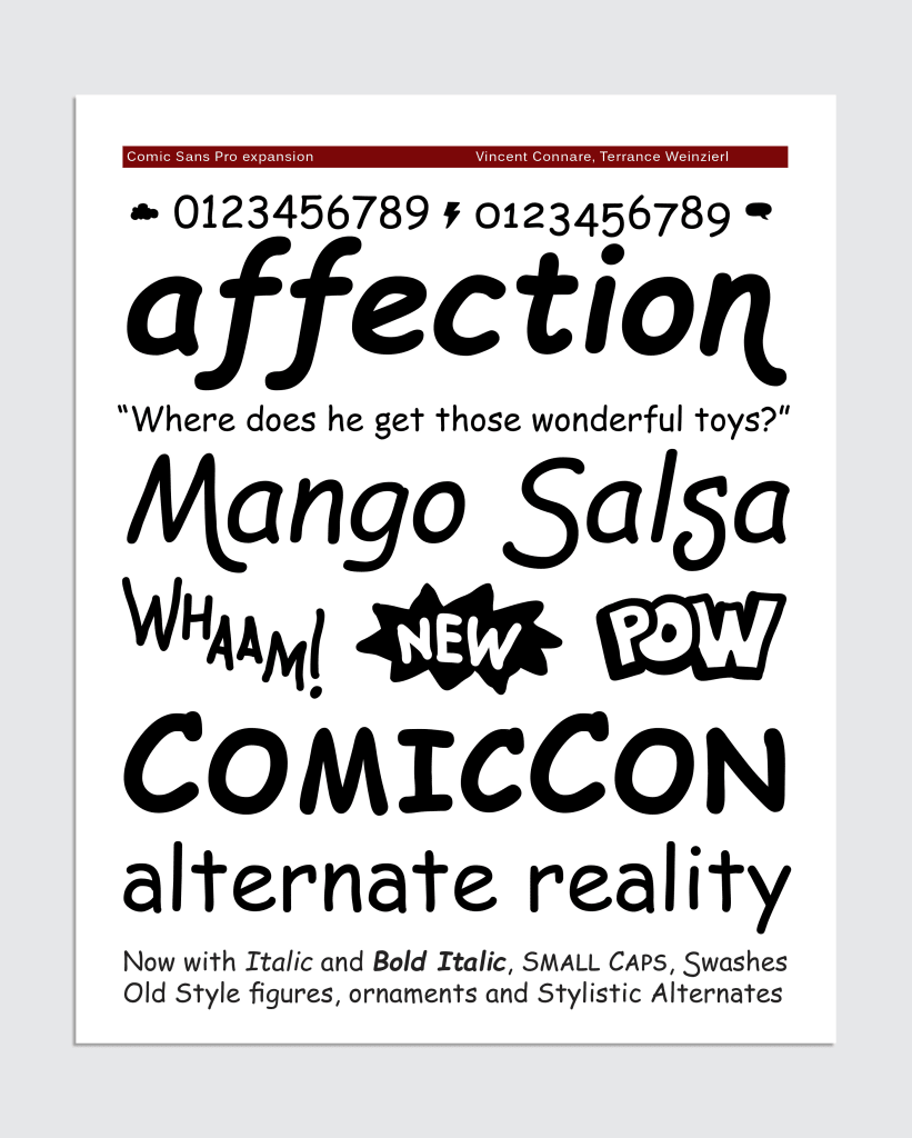 The boom continued well into the early aughts, at which point Microsoft released a licensed version of Comic Sans in 2010. The extended typeface family, which came with italics, plus extras like swashes, small capitals, ornaments, and dingbats, made the font commercially available to anyone willing to pay $120 for it. It was released widely in 2011—on April Fool’s Day—and renamed Comic Sans Pro. “It was real, but it was in on the joke,” said Terrance Weinzierl, now creative type director at Monotype, who created the extended font at the time.