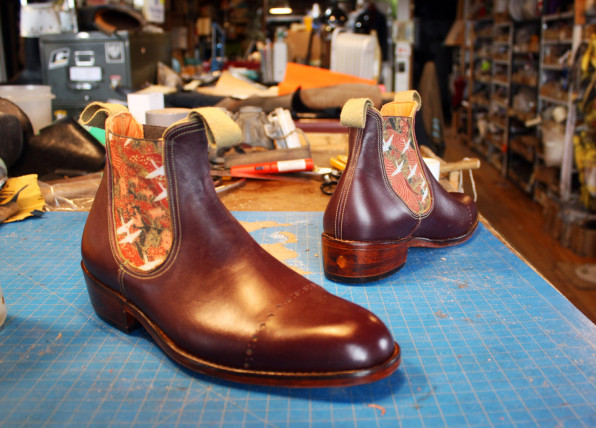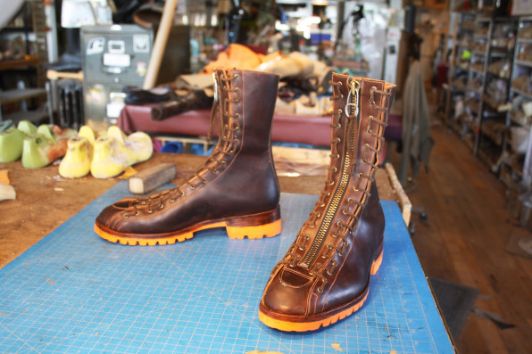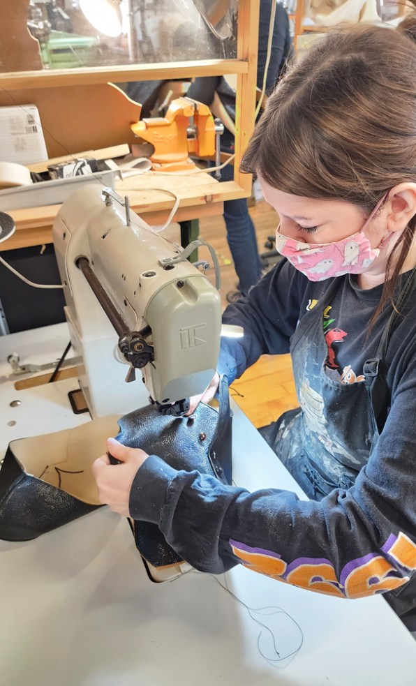 Jitterbug Boy stitcher-team member Mel demonstrating the sewing process on a custom boot [Photo: Dori Tunstall]