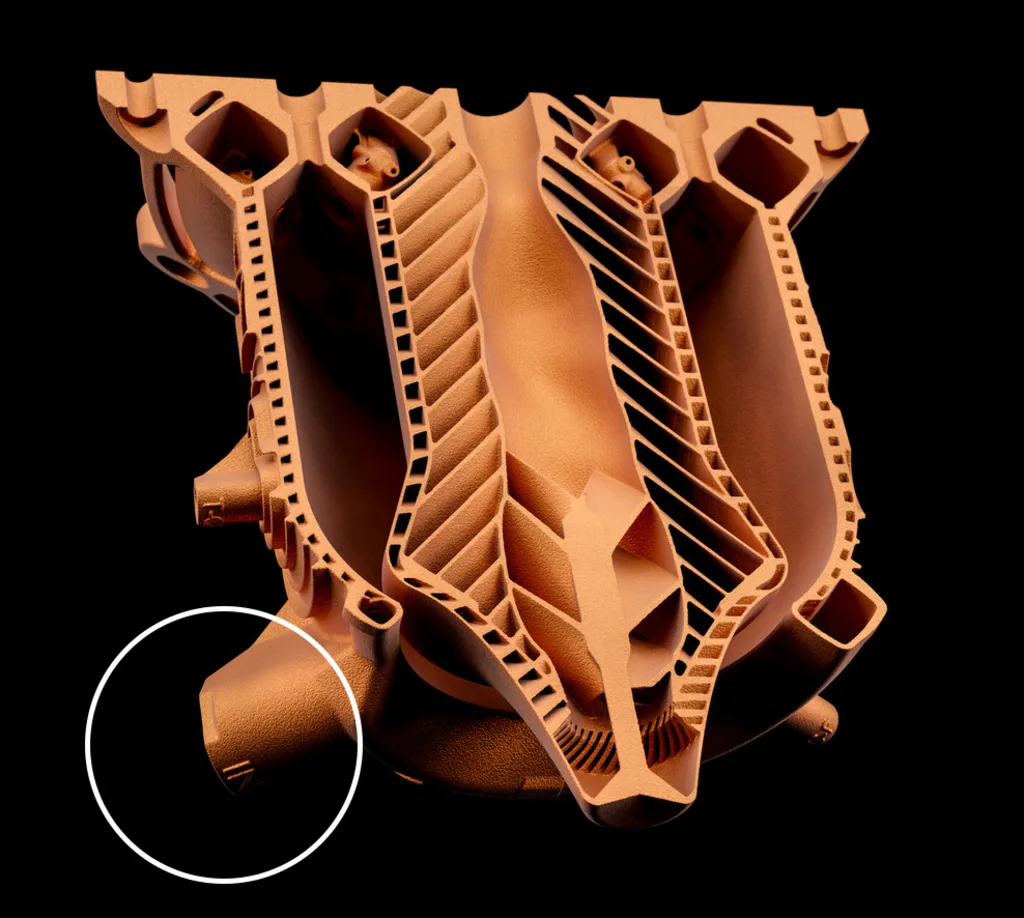 This method melts ultra-fine metal powder, a special alloy made of Copper (the base metal, known for its excellent thermal and electrical conductivity), Chromium (added to improve strength and wear resistance without significantly reducing conductivity), and Zirconium (which Enhances grain structure stability and resistance to high temperatures). The laser melts and solidifies the powder layer by layer, enabling the creation of those complex cooling channels inside the spike and chamber.