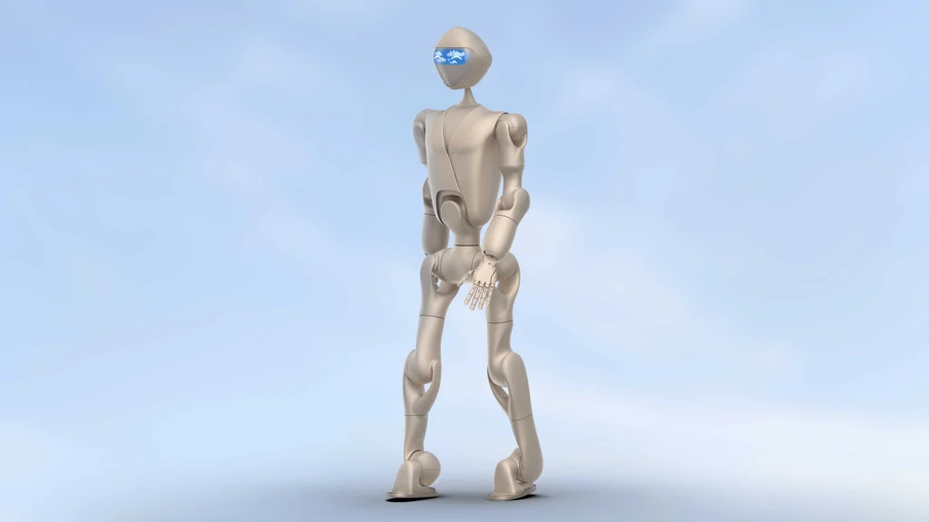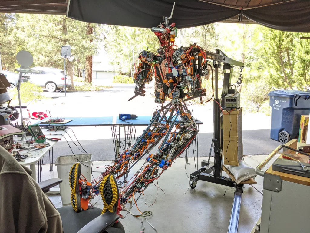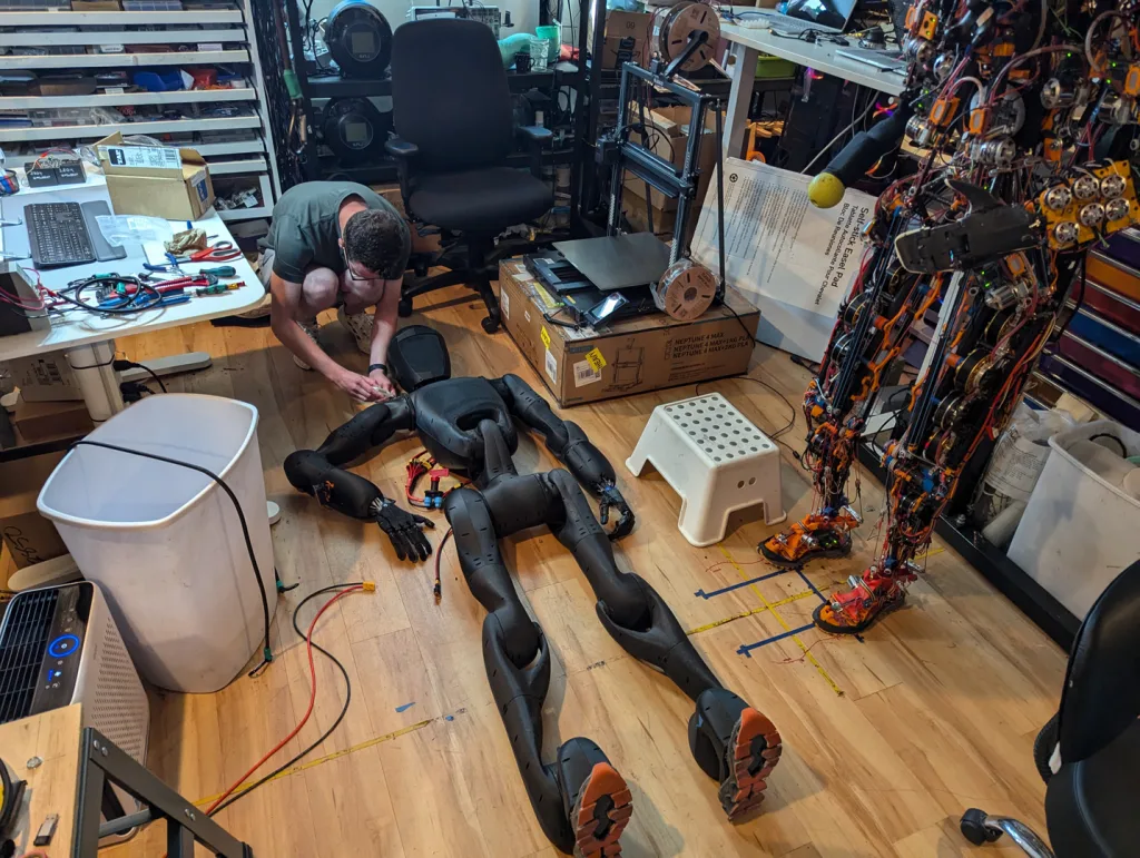Behind him hangs his company’s first prototype, an unskinned humanoid robot that could be your shame box of cords gone sentient. While it’s naked for now, a nearby 3D printer is creating a panel that will form its shell.