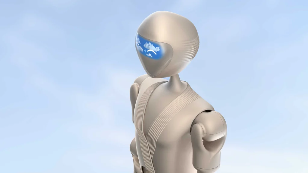 But while the system is a humanoid that stands on two legs and grasps things with two hands, it’s not designed to literally look human. Instead, the design firm Fuseproject was inspired by the 20th century surrealist Rene Magritte, who depicted people with objects obstructing their faces. Instead of a nose and mouth, the robot will feature a large visor that depicts animations of clouds and sky that almost resemble a desktop wallpaper. A pair of eyes float within this scenery to convey intent—morphing into eyebrows for a smile or a series of dots when it’s thinking.