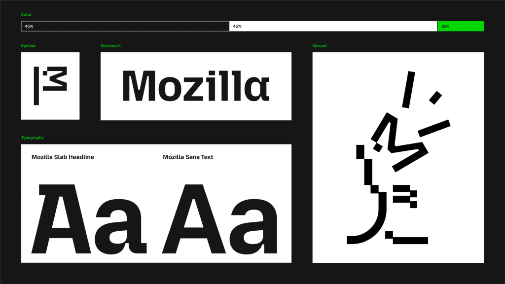 Big picture: As a brand, Mozilla creates guides to privacy, publishes open-source standards, organizes the community event Mozfest, operates its own ventures arm, and recently acquired an advertising platform called Anonym. Of course, it’s most known for running the privacy-centric browser Firefox. To bring all of those seemingly disparate endeavors together under one visual umbrella, Mozilla needed a more cohesive set of branding guidelines. The new look, designed by JKR, includes a clever reference to a former T-rex logo and a clean custom font, accented with bright pops of green.