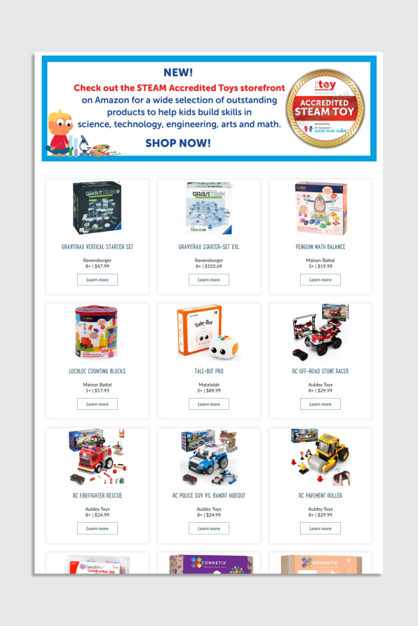 In response, the Toy Association created an accreditation program for STEAM toys, partnering with the Good Play Guide, a U.K.-based reviewer of children’s products founded by a child development specialist. Together they developed an assessment framework for determining whether a toy offers the educational merits suggested by a STEAM label.