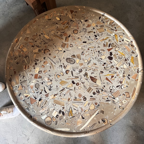 Now, flecks of old ground-up materials are being mixed into new more sustainable plastics, molded into all manner of furniture. Samples of such materials were all over Milan. I saw dozens and dozens of sample swatches on display, eagerly being studied by designers. I even visited a concrete-focused studio, Cement Design, that offers a concrete paint flecked with old denim.