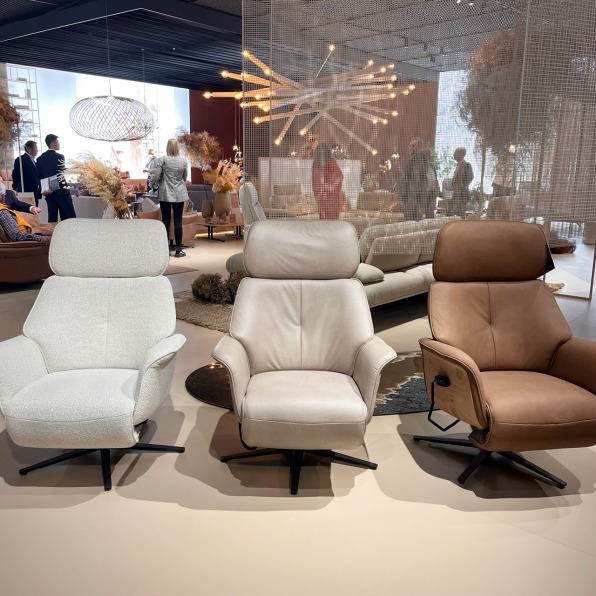 I also saw swiveling on low-slung and high-back chairs, outdoor seating, and even couches. Yes, couch seats were swiveling all over the Koinor booth, allowing you the opportunity to turn toward, or away from, the person sitting right next to you.