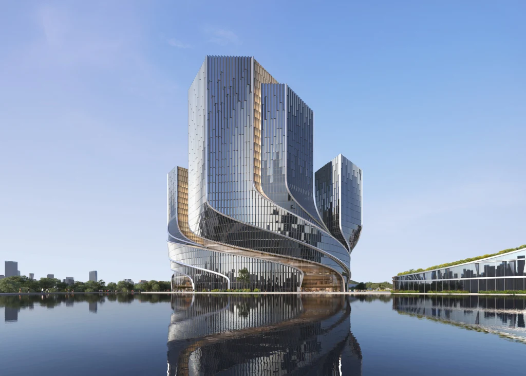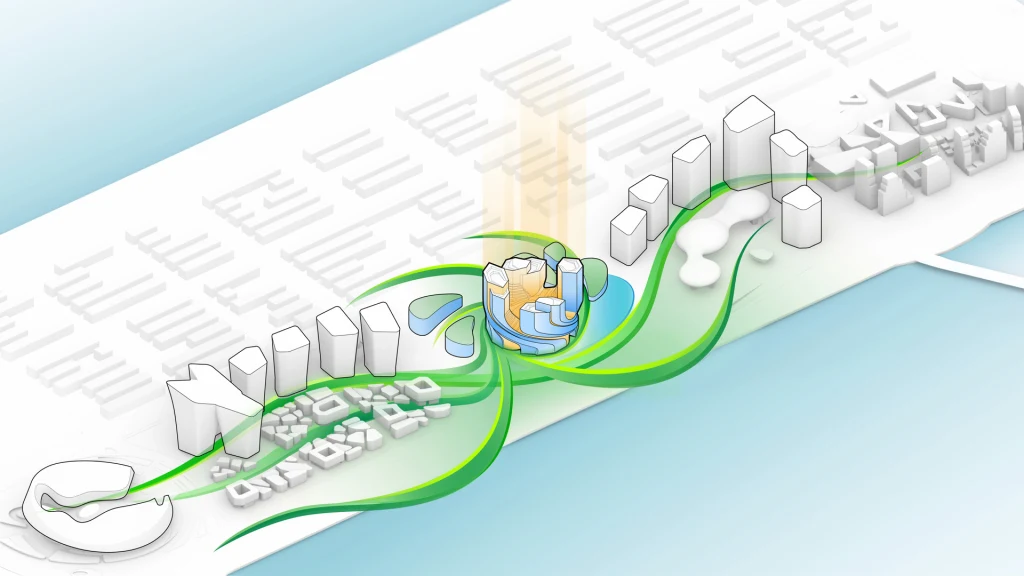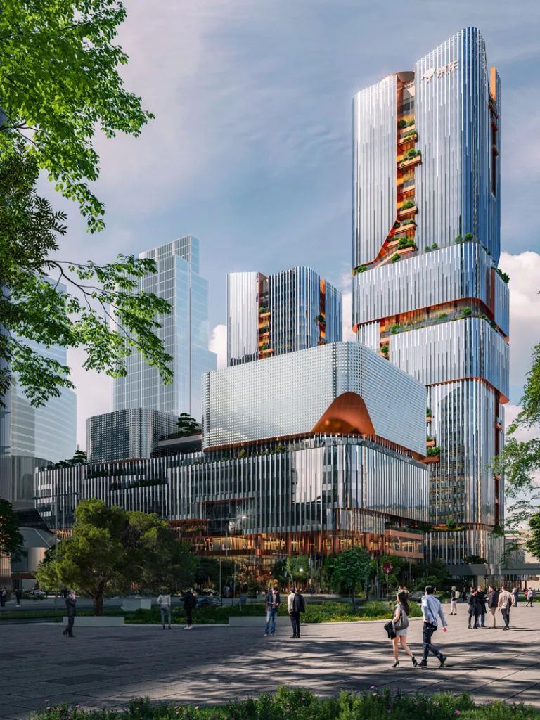 Another forthcoming project is the significantly larger headquarters of Tencent, the video game and technology conglomerate behind WeChat. About twice as big as Apple’s spaceship-like campus in Cupertino, California, Tencent’s new headquarters will be a swirling ring of towers that converge in a park-topped central base that includes collaboration spaces, a conference center, public plazas, a health club, and a variety of recreational spaces for employees and the public. Covering roughly 5 million square feet, it’s a megadevelopment that aims to become a new urban center in the city. Construction will begin later this year.