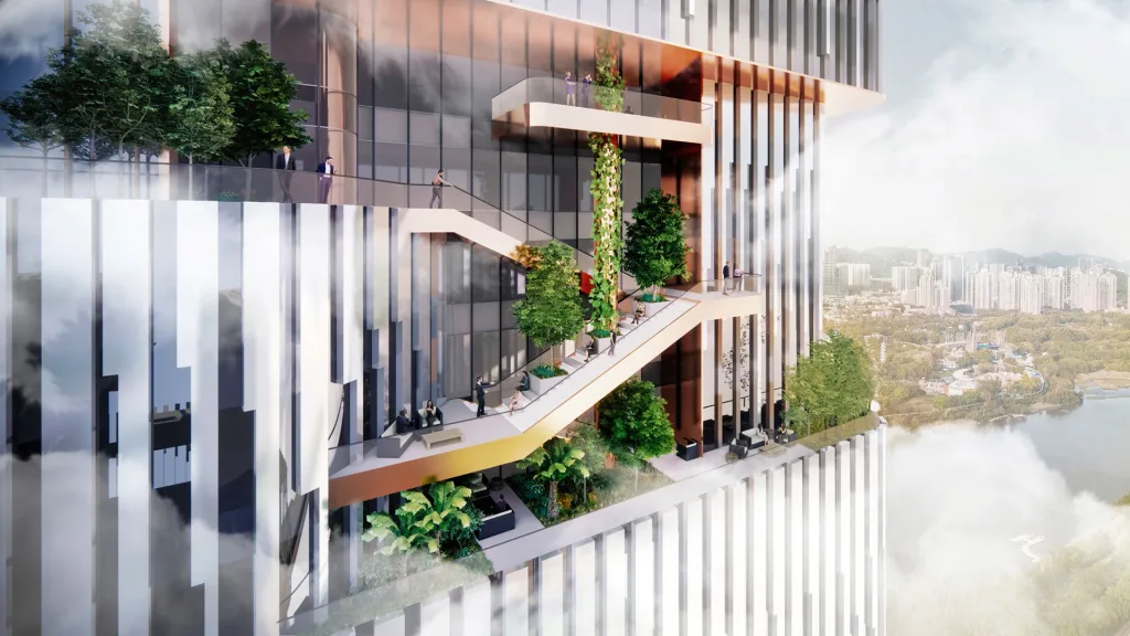 One of these projects, revealed here for the first time in exclusive images, is the forthcoming Shenzhen headquarters of JD.com, China’s largest digital retailer. A two-tower megablock covering more than 2 million square feet, the project is a mix of offices, retail, a museum and exhibition hall, and publicly accessible courtyards and plazas throughout its podium. Running up and wrapping around the sides of the towers are large cutaway sections that create space of terraces and balconies that give each floor multiple points of access to the outdoors.