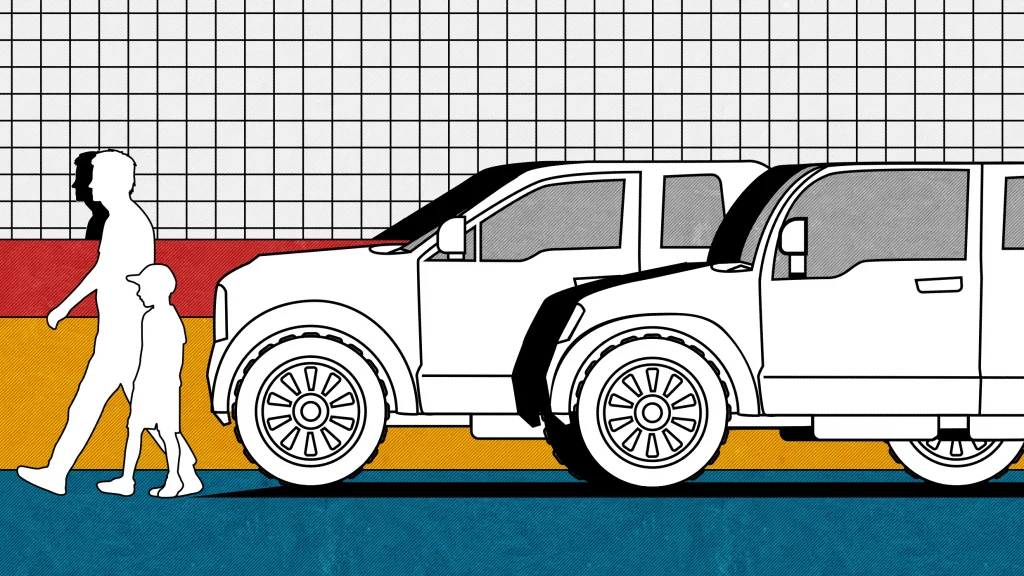 Crossing the street in front of a gigantic modern pickup truck feels like an act of bravery—because it is: It’s rarely clear whether the driver can actually see you. As SUVs and trucks have gotten bigger—the average pickup got 11% taller and 24% heavier between 2000 and 2018—they’ve also become deadlier. A study looking at six years of crashes found that pedestrians were 68% more likely to die if they were hit by a pickup than a car; full-size SUVs make death 99% more likely. It doesn’t help that Americans have abandoned smaller sedans, so there are many more large vehicles on the road.