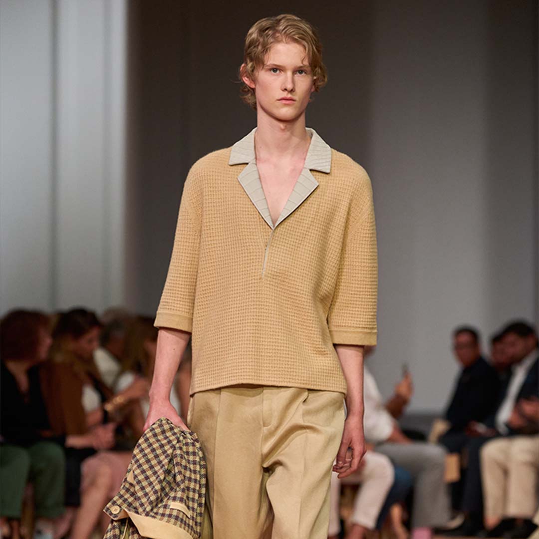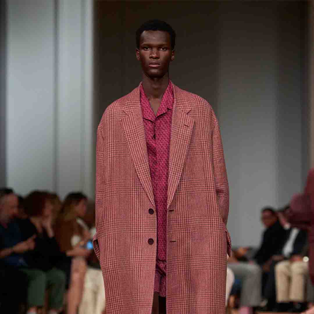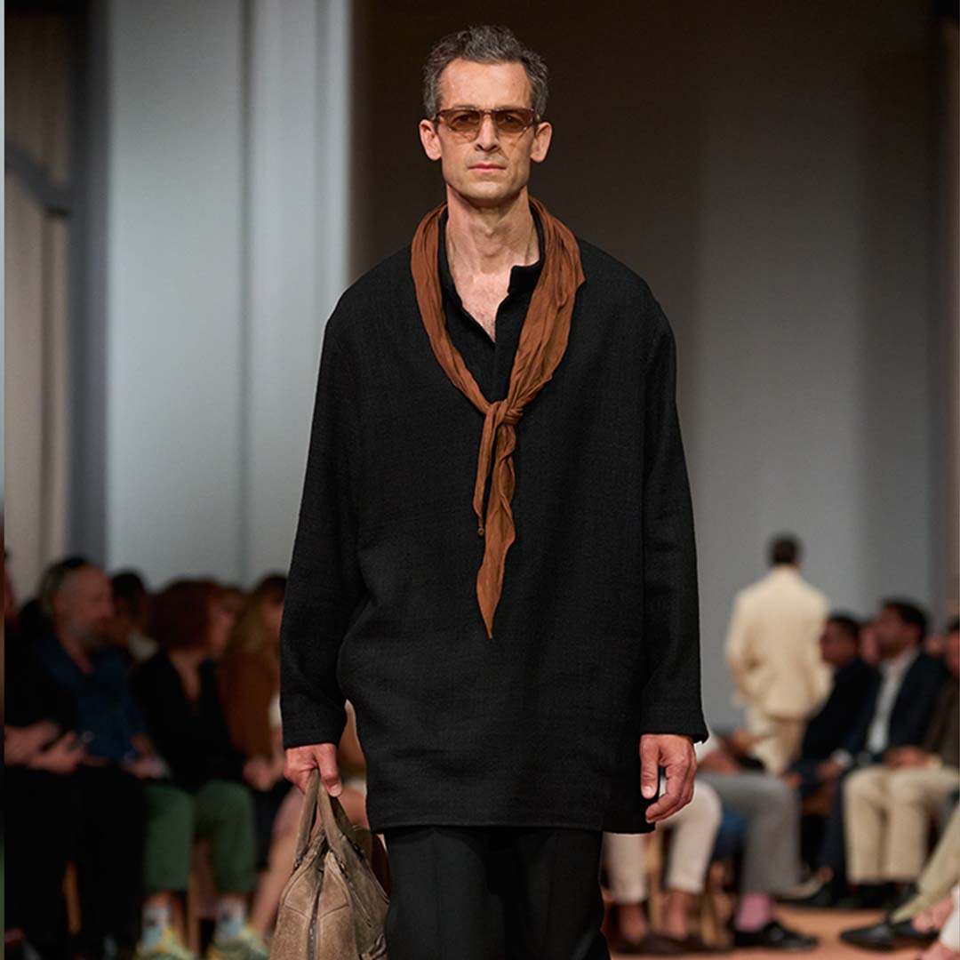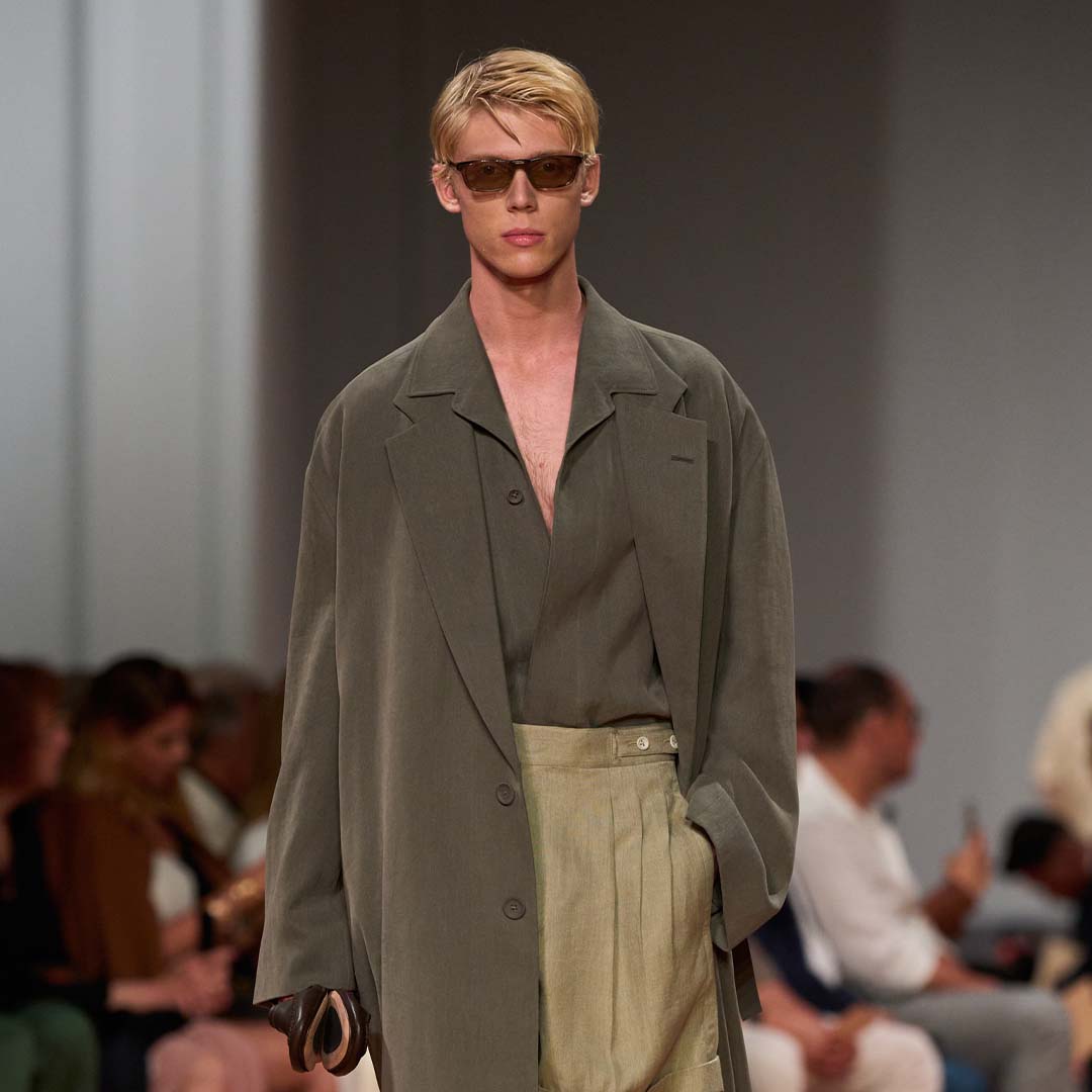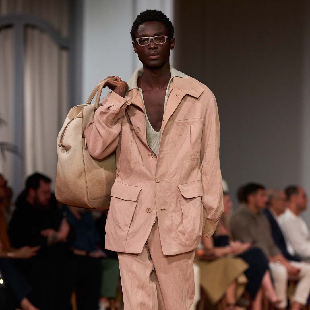 The collection featured Nehru-style shirts, tailored shorts under summer coats, blousons, weightless leather jackets, and pajama-stripe suiting. Zegna’s signature blending of categories, outerwear and shirting, formal and casual, was a central theme. Accessories included soft moccasins, wraparound sunglasses, and oversized bags.